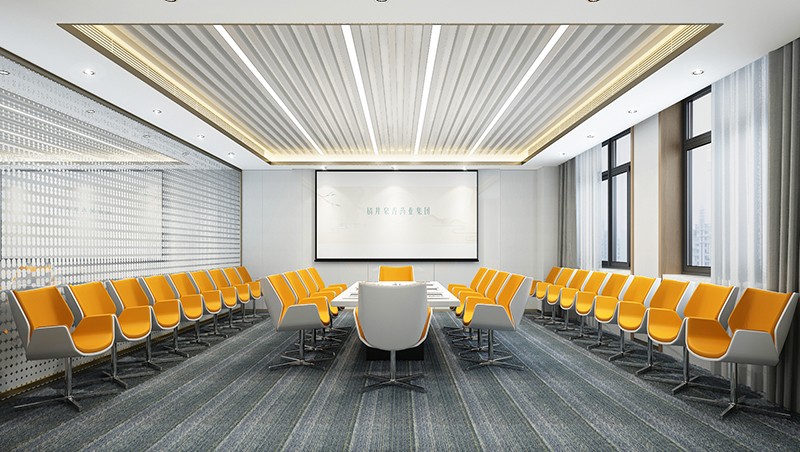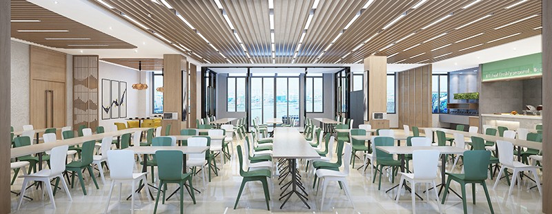 設計理念:該項目為藥業企業辦公樓裝修,整個空間裝修風格為新中式,選用木色作為主要色調,黑白色和金屬色描畫出輪廓,展現溫馨親和并且體現出作為辦公空間的大氣感。設計師在滿足基本功能需求的前提下,借助空間架構與細節設計,呈現空間的藝術性和當代性。該裝修設計項目是一個企業集團辦公樓內的餐廳空間,包括一層的員工餐廳和三層的餐廳包間。設計一樓的員工餐廳主要體現干凈整潔明亮的特點。大開敞的就餐空間采光明亮,簡潔而鮮明的內飾與環境自然融為一體。讓人在獲得無盡放松心情的同時,感受古與今的文化碰撞和獨樹一幟的品牌力量。包間的色調以灰白色、古銅色為主打色調,咖色原木色點綴,整個空間溫雅而舒適, 沉穩而大氣。
