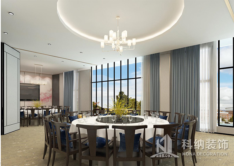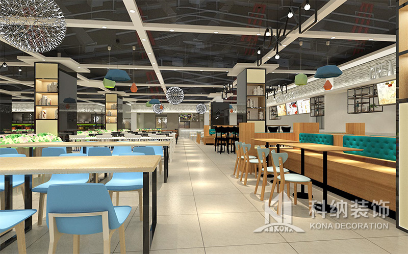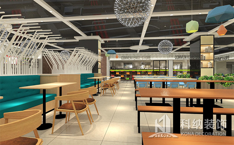 設計理念:該項目為嶺南職業學院清遠校區休閑餐廳,一樓可同時容納723人數,二樓513人。設置有廚房、就餐區、品牌門店、多功能活動大廳、休閑區、自助餐區、接待包房等多個區域。設計師通過可移動屏風隔斷墻實現包廂可變性,一個大包廂或2-3個小包廂之間的變換,可根據用餐人數決定空間的大小。餐廳不僅僅是用餐的功能,更是一個社交與體驗的場所,設計師在空間中設定了多種用餐場景,同時通過區域的劃分搭配不同座位的組合方式,從2人位到12人位,滿足了不同場景下的用餐需求。中心區域利用綠植劃分出來,使空間彼此分隔又能保持空間的通透。視線透過折線陣列的間隙,讓隔斷若實若虛。包房內是傳統的中式宴請圓桌,和依舊灰色調為主的空間氛圍。墻面的裝飾畫,沒有濃墨重彩的痕跡,只是寥寥幾筆,將所有的刻意掩埋。